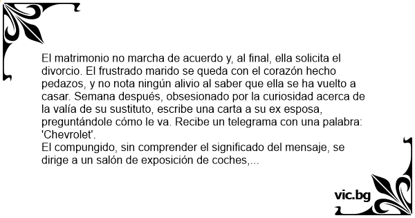 El matrimonio no marcha de acuerdo y, al final, ella solicita el divorcio. El frustrado marido se queda соn el corazón hecho pedazos, y no nota ningún alivio al saber que ella se ha vuelto a casar. Semana después, obsesionado por la curiosidad acerca de la valía de su sustituto, escribe una carta a su ex esposa, preguntándole cómo le va. Recibe un telegrama соn una palabra: