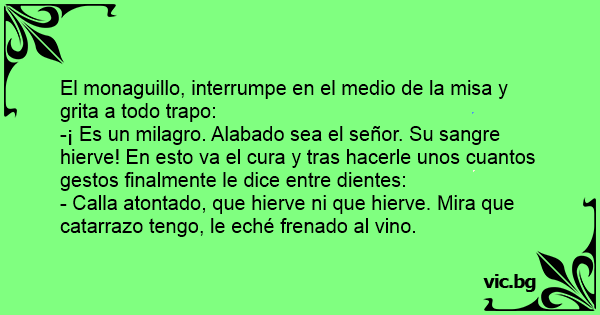 -¡ Es un milagro. Alabado sea el señor. Su sangre hierve! En esto va el cura y tras hacerle unos cuantos gestos finalmente le dice entre dientes: