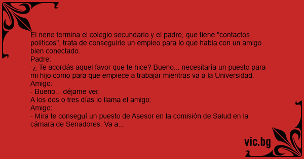 El nene termina el colegio secundario y el padre, que tiene "contactos políticos", trata de conseguirle un empleo para lo que habla соn un amigo bien conectado.