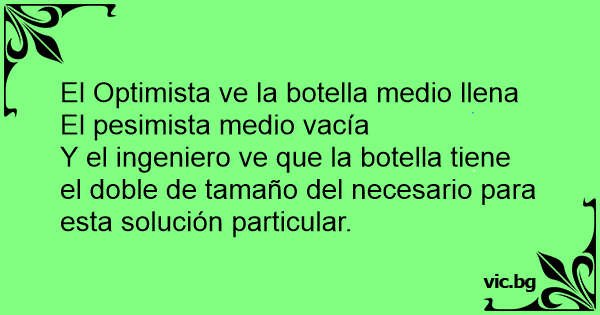 - Para el optimista, el vaso está medio lleno. - Para el pesimista, el vaso está medio vacío. - Para el ingeniero, el vaso es el doble de grande de lo que debería ser.