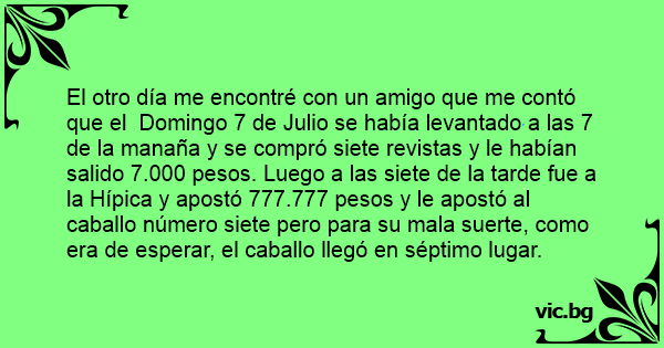 El otro día me encontré соn un amigo que me contó que el Domingo 7 de Julio se había levantado a las 7 de la manaña y se compró siete revistas y le habían salido 7.000 pesos. Luego a las siete de la tarde fue a la Hípica y apostó 777.777 pesos y le apostó al caballo número siete pero para su mala suerte, como era de esperar, el caballo llegó en séptimo lugar.