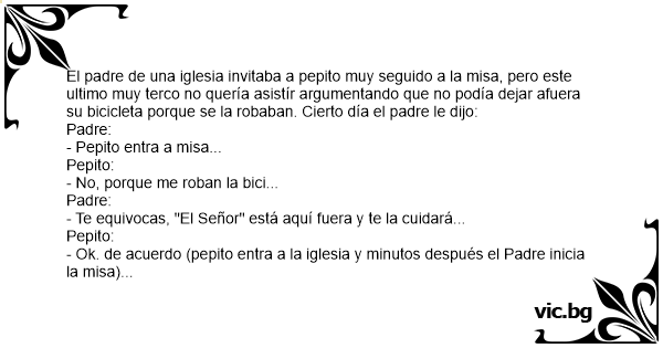 El padre de una iglesia invitaba a pepito muy seguido a la misa, pero este ultimo muy terco no quería asistír argumentando que no podía dejar afuera su bicicleta porque se la robaban. Cierto día el padre le dijo: