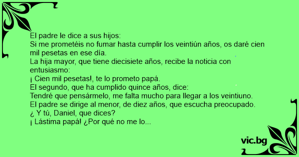 Si me prometéis no fumar hasta cumplir los veintiún años, os daré cien mil pesetas en ese día.