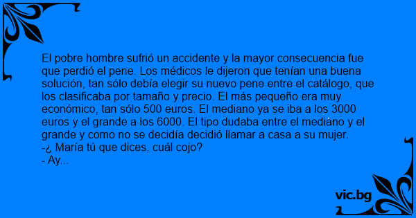 El pobre hombre sufrió un accidente y la mayor consecuencia fue que perdió el pene. Los médicos le dijeron que tenían una buena solución, tan sólo debía elegir su nuevo pene entre el catálogo, que los clasificaba por tamaño y precio. El más pequeño era muy económico, tan sólo 500 euros. El mediano ya se iba a los 3000 euros y el grande a los 6000. El tipo dudaba entre el mediano y el grande y como no se decidía decidió llamar a casa a su mujer.