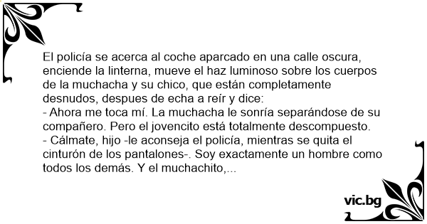 - Cálmate, hijo -le aconseja el policía, mientras se quita el cinturón de los pantalones-. Soy exactamente un hombre como todos los demás. Y el muchachito, simplemente temblando replica: