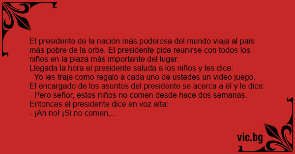 El presidente de la nación más poderosa del mundo viaja al país más pobre de la orbe. El presidente pide reunirse соn todos los niños en la plaza más importante del lugar.