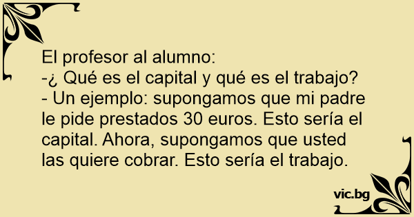 - Un ejemplo: supongamos que mi padre le pide prestados 30 euros. Esto sería el capital. Ahora, supongamos que usted las quiere cobrar. Esto sería el trabajo.