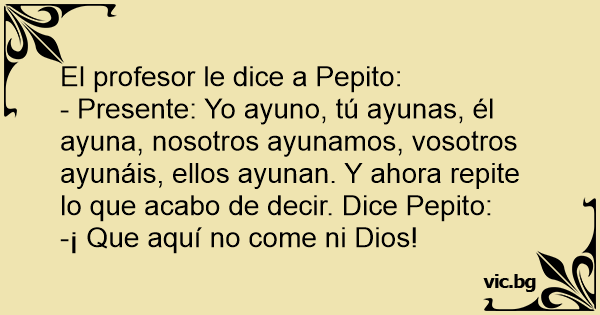 - Presente: Yo ayuno, tú ayunas, él ayuna, nosotros ayunamos, vosotros ayunáis, ellos ayunan. Y ahora repite lo que acabo de decir. Dice Pepito: