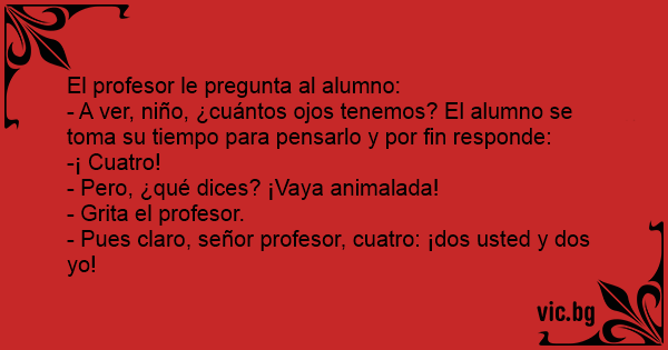 - A ver, niño, ¿cuántos ojos tenemos? El alumno se toma su tiempo para pensarlo y por fin responde: