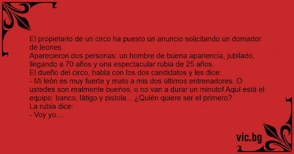 - Mi león es muy fuerte y mato a mis dos últimos entrenadores. O ustedes son realmente buenos, o no van a durar un minuto! Aquí está el equipo: banco, látigo y рisтоlа... ¿Quién quiere ser el primero?