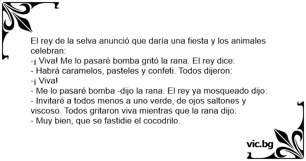-¡ Viva! Me lo pasaré bomba gritó la rana. El rey dice: