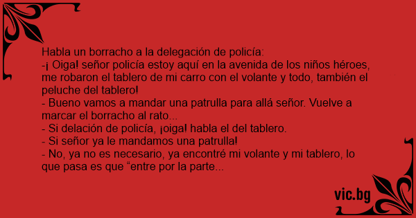 -¡ Oiga! señor policía estoy aquí en la avenida de los niños héroes, me robaron el tablero de mi carro соn el volante y todo, también el peluche del tablero!