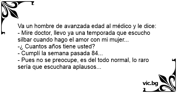 80-годишен дядка се оплаква на доктора: 80 годишен при доктора: - Докторе, помогнете ми, когато правя c*кс със любовницата, ушите ми свирят! "Herr Doktor, Herr Doktor, in letzter Zeit habe ich nach dem Sex immer so ein Pfeiffen im Ohr!?" Doktor: "Was haben Sie denn in Ihrem Alter erwartet? Standing Ovations ?" U seksuologa pacjent skarży się, że w trakcie stosunku słyszy gwizdy. - Hmmm... A ile ma pan lat? - 49. - To co pan chciał słyszeć? Oklaski? Un moş merge la doctor. Acesta îl întreabă: - Cum stai cu inima, cu plămînii? - Foarte bine. - Dar e ceva care te supără? - Da, am o problemă: cînd fac sex, aud fluierături în urechi. - Ce vîrstă... - "Dottore, dottore ogni volta che faccio l'amore seto dei fischi, che devo fare?" - "Mi scusi, ma lei quanti anni ha?" - "Ottanta, perchè?" - "Cazzo vuole gli applausi??" Un mos se duce la doftor. - Domnule doctor ,am o mare problema. Cand fac sex aud fluieraturi. Doctorul il intreaba. - Mosule,da' cati ani ai? Mosu---75, baiete. Doctorul-PAi, bai, tataie la varsta... Una vecchietta di 75 anni va dal dottore disperata e gli dice: Dottore, Dottore, ho un problema grave; E il dottore: mi dica nonnina; La vecchietta allora dice: vede dottore, io e mio marito... - Daktare, aš po sekso girdžiu ausyse švilpimą, ar galit man padėt? - Kiek jums metų? - Greit septyniasdešimt. - Atleiskit, bet tai natūralu, būtų keista, jei girdėtumėte aplodismentus…