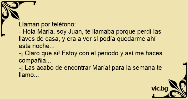 - Hola María, soy Juan, te llamaba porque perdí las llaves de casa, y era a ver si podía quedarme ahí esta noche...