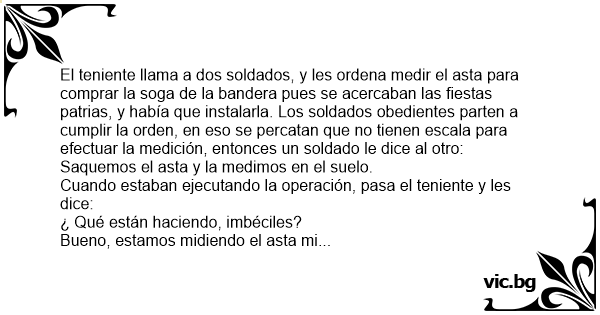 El teniente llama a dos soldados, y les ordena medir el asta para comprar la soga de la bandera pues se acercaban las fiestas patrias, y había que instalarla. Los soldados obedientes parten a cumplir la orden, en eso se percatan que no tienen escala para efectuar la medición, entonces un soldado le dice al otro: