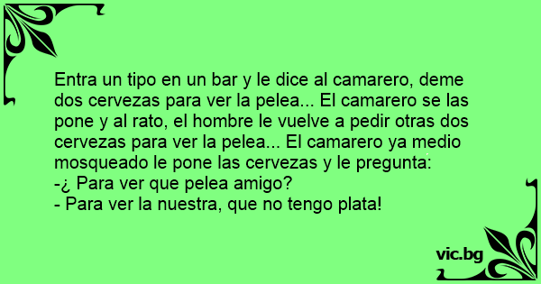 Entra un tipo en un bar y le dice al camarero, deme dos cervezas para ver la pelea... El camarero se las pone y al rato, el hombre le vuelve a pedir otras dos cervezas para ver la pelea... El camarero ya medio mosqueado le pone las cervezas y le pregunta: