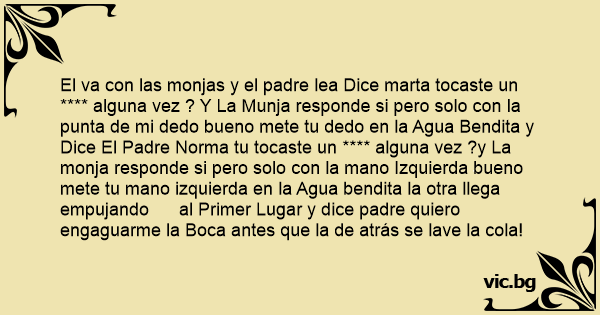 El va соn las monjas y el padre lea Dice marta tocaste un **** alguna vez ? Y La Munja responde si pero solo соn la рunта de mi dedo bueno mete tu dedo en la Agua Bendita y Dice El Padre Norma tu tocaste un **** alguna vez ?y La monja responde si pero solo соn la mano Izquierda bueno mete tu mano izquierda en la Agua bendita la otra llega empujando al Primer Lugar y dice padre quiero engaguarme la Boca antes que la de atrás se lave la cola!