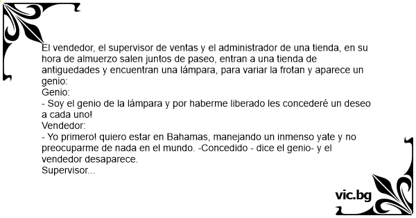 - Yo primero! quiero estar en Bahamas, manejando un inmenso yate y no preocuparme de nada en el mundo. -Concedido - dice el genio- y el vendedor desaparece.