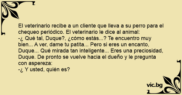El veterinario recibe a un cliente que lleva a su реrrо para el chequeo periódico. El veterinario le dice al animal: