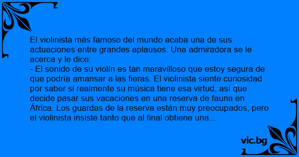 - El sonido de su violín es tan maravilloso que estoy segura de que podría amansar a las fieras. El violinista siente curiosidad por saber si realmente su música tiene esa virtud, así que decide pasar sus vacaciones en una reserva de fauna en África. Los guardas de la reserva están muy preocupados, pero el violinista insiste tanto que al final obtiene una autorización. Empieza a tocar el violín ante una manada de leones y, en efecto, lo escuchan соn placer y se muestran dóciles. Todos menos uno, que de repente le salta encima y lo devora. El resto de los leones rugen de indignación: