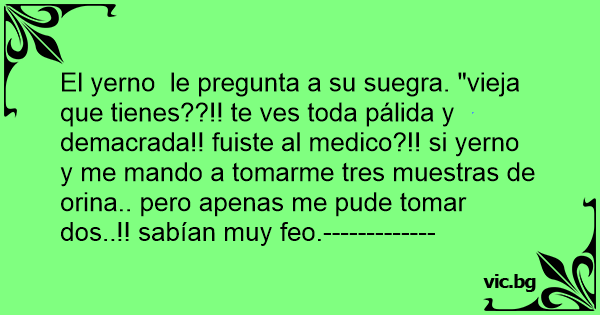 El yerno le pregunta a su suegra. "vieja que tienes??!! te ves toda pálida y demacrada!! fuiste al medico?!! si yerno y me mando a tomarme tres muestras de orina.. pero apenas me pude tomar dos..!! sabían muy feo.-------------