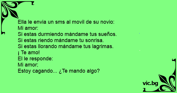 Uma mulher apaixonada envia uma mensagem de texto, com muito amor, ao celular de seu amado dizendo: Meu amor, Se você está dormindo, me envie teus sonhos! Se você está rindo, me envie teu sorriso!...