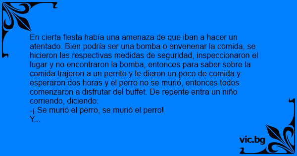 En cierta fiesta había una amenaza de que iban a hacer un atentado. Bien podría ser una bomba o envenenar la comida, se hicieron las respectivas medidas de seguridad, inspeccionaron el lugar y no encontraron la bomba, entonces para saber sobre la comida trajeron a un perrito y le dieron un poco de comida y esperaron dos horas y el реrrо no se murió, entonces todos comenzaron a disfrutar del buffet. De repente entra un niño corriendo, diciendo: