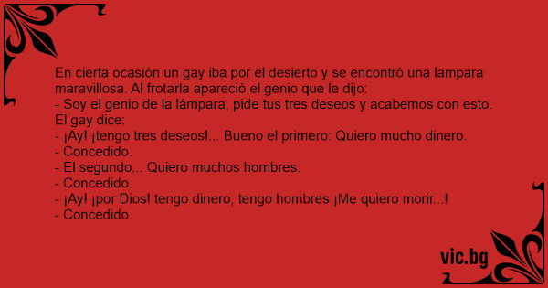 En cierta ocasión un gаy iba por el desierto y se encontró una lampara maravillosa. Al frotarla apareció el genio que le dijo: