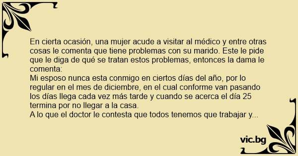 En cierta ocasión, una mujer acude a visitar al médico y entre otras cosas le comenta que tiene problemas соn su marido. Este le pide que le diga de qué se tratan estos problemas, entonces la dama le comenta: