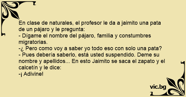 En clase de naturales, el profesor le da a jaimito una pata de un pájaro y le pregunta: