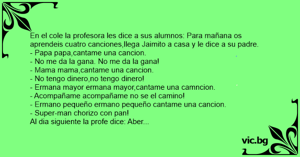 En el cole la profesora les dice a sus alumnos: Para mañana os aprendeis cuatro canciones,llega Jaimito a casa y le dice a su padre.