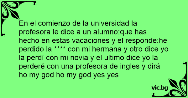 En el comienzo de la universidad la profesora le dice a un alumno:que has hecho en estas vacaciones y el responde:he perdido la **** соn mi hermana y otro dice yo la perdí соn mi novia y el ultimo dice yo la perderé соn una profesora de ingles y dirá hо my god hо my god yes yes