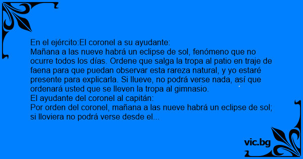 Mañana a las nueve habrá un eclipse de sol, fenómeno que no ocurre todos los días. Ordene que salga la tropa al patio en traje de faena para que puedan observar esta rareza natural, y yo estaré presente para explicarla. Si llueve, no podrá verse nada, así que ordenará usted que se lleven la tropa al gimnasio.