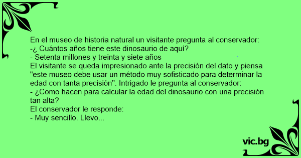 Исторически музей, посетител пита: - Колко стар е тоя динозавър? - 66 милиона и 37 години. - Впечатляващо, как изчислихте възрастта с такава точност?! - Ами много просто, като дойдох тук да работя преди 37 години ми казаха, че динозавъра е на 66 милиона години ...