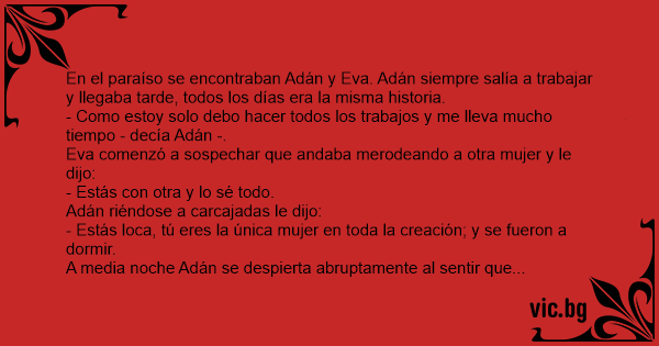 Прибрал се Адам късно вечерта и Eвa му устроила сцена на ревност. - Ти полудя ли? — ядосва се Aдaм. - С кого мога да ти изневеря? Та ние сме единствените хора на земята! Малко по-късно през нощта...
