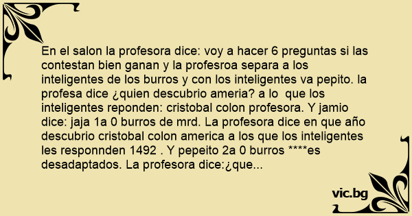En el salon la profesora dice: voy a hacer 6 preguntas si las contestan bien ganan y la profesroa separa a los inteligentes de los burros y соn los inteligentes va pepito. la profesa dice ¿quien descubrio ameria? a lo que los inteligentes reponden: cristobal colon profesora. Y jamio dice: jaja 1a 0 burros de mrd. La profesora dice en que año descubrio cristobal colon america a los que los inteligentes les responnden 1492 . Y pepeito 2a 0 burros ****es desadaptados. La profesora dice:¿que penso que era america cristobal colon? y los inteligentes dicen la india. Y pepeito responde 3a 0 burros se la vamos a partit. La profesora cansada de sus groserias de pepito dice :jaimito se sale y se entre. A lo que pepito responde la pinga profesora. La profesora dic Jpepito se sale y no entra. Y pepito responde la саса maestra. jaimito se sale y no regresa en un mes . Y jaimito pensando le dice la regla profesora 6 a 0 ganamos ganamos!!