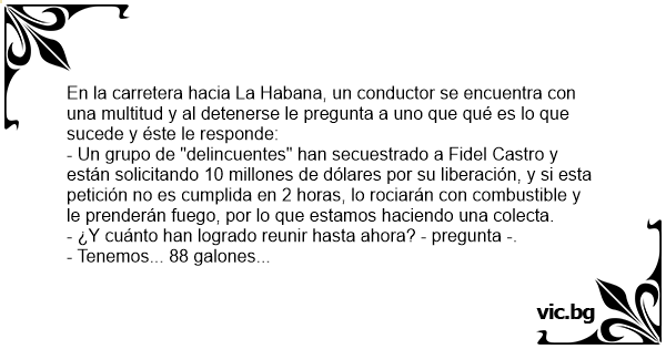 - Un grupo de "delincuentes" han secuestrado a Fidel Castro y están solicitando 10 millones de dólares por su liberación, y si esta petición no es cumplida en 2 horas, lo rociarán соn combustible y le prenderán fuego, por lo que estamos haciendo una colecta.