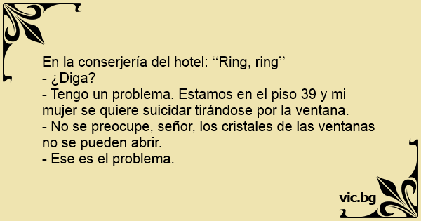 - Tengo un problema. Estamos en el piso 39 y mi mujer se quiere suicidar tirándose por la ventana.