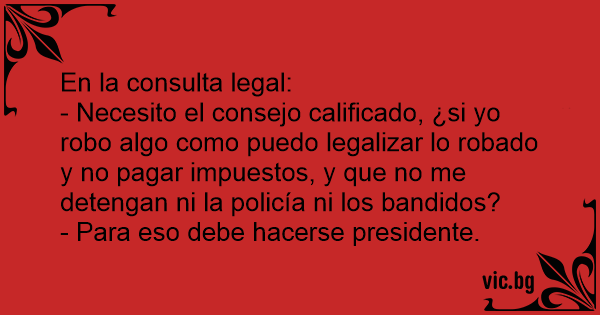 - Necesito el consejo calificado, ¿si yo robo algo como puedo legalizar lo robado y no pagar impuestos, y que no me detengan ni la policía ni los bandidos?