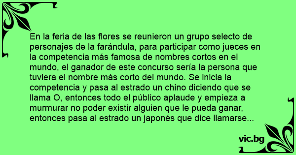 En la feria de las flores se reunieron un grupo selecto de personajes de la farándula, para participar como jueces en la competencia más famosa de nombres cortos en el mundo, el ganador de este concurso sería la persona que tuviera el nombre más corto del mundo. Se inicia la competencia y pasa al estrado un chino diciendo que se llama O, entonces todo el público aplaude y empieza a murmurar no poder existir alguien que le pueda ganar, entonces pasa al estrado un japonés que dice llamarse casio y todo el mundo empieza a aplaudir y a exclamar que nadie le podrá ganar, entonces pasa el último concursante un mexicano y los jueces le preguntan: