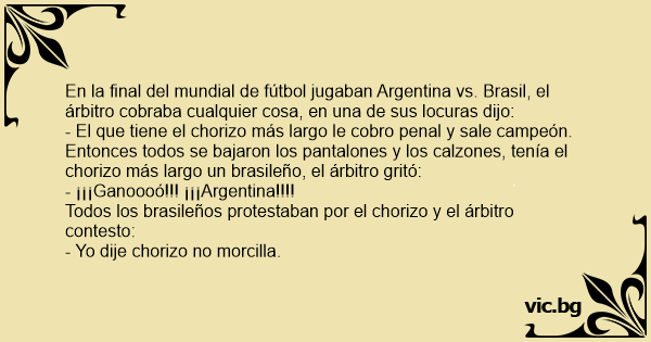 En la final del mundial de fútbol jugaban Argentina vs. Brasil, el árbitro cobraba cualquier cosa, en una de sus locuras dijo:
