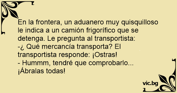En la frontera, un aduanero muy quisquilloso le indica a un camión frigorífico que se detenga. Le pregunta al transportista: