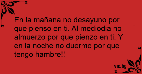 En la mañana no desayuno por que pienso en ti. Al mediodia no almuerzo por que pienzo en ti. Y en la noche no duermo por que tengo hambre!!