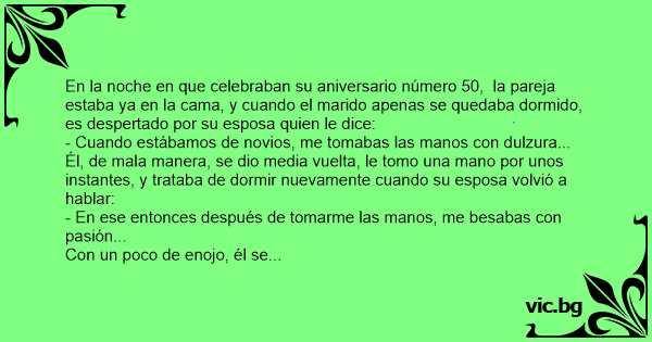 Con un poco de enojo, él se volteo nuevamente, le besó la mejilla, suspiró y trataba de dormir nuevamente cuando su esposa volvió a hablar: