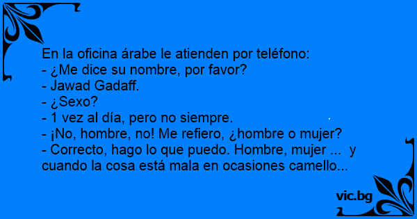 Do you speak english? Interviewer: Αχμέτ Χουσεϊν Temel Amerika'ya gelir uçaktan iner pasaport olayı filan falan - Do you speak English? Reporter: "Excuse me, may I interview you?" — Qual o seu nome? "Name?" Neulich bei der Einwanderungsbehörde:,"Name?","Abu Dalah Sarafi.","Sex?","Four times a week.","No, no, no... male or female?","Male, female... sometimes camel..." No balcão da Alfandega: Seu nome ? Abu Abdalah Sarafi. Sexo? Quatro vezes por semana. Não, não, não! Homem ou mulher? Homem, mulher. Algumas vezes camelo. - Name? - Abdul Anubi al-Dzabiri. - Sex? - Four times a week - No, no, male or female? - Male, female, sometimes camel... En man som är dålig på engelska kommer in på en arbetsförmedling i Holland för att söka jobb! - Name - Abu Dalah Sarafi. - Sex? - Four times a week. - No, no, no, male or female? - Male,... Q: Your name please? A: Abdul Aziz Q: Sex? A: Yes. Two times every week. Q: No no. I mean, Male or Female? A: Not matter. Sometimes also camel ! An arab at the airport: - Name? - Abdul al-Rhazib. - Sex? - Three to five times a week. - No, no... I mean male or female? - Male, female, sometimes camel. - Holy cow! - Cow, sheep, animals in... An arab at the airport: - Name? - Abdul al Rahzib. - Sex? - Three to five times a week. - No, no...I mean Male or female? - Male, female, sometimes camel. - Holy cow! - Yes, cow, sheep,... Q: Naam? A: Abdul Asis Q: Sexe? A: Ja iedere week 2 keer. Q: Nee, ik bedoel man of vrouw? A: Maakt niet uit, soms ook kameel. All’Ufficio Immigrazioni: – Nome? – Mhoamhed. – Sesso? – 5 volte alla settimana. – Ma non in quel senso: maschio o femmina? – No importa, a volte anche con cammelli. Chiedono a Gheddafi: "ciao, nome?" e lui: "Gheddafi", e poi: "sesso?" e lui risponde: "cinque volte al giorno!" e loro chiedono: "con maschio o femmina?" e lui: "va bene anche cammello!". - NAME? - Muhjmatil Ahmed. - SEX? - Three times a week! - NO, I MEAN; MALE OR FEMALE? - Doesnt matter. Sometimes even with camel... - Name? - Abdul al-Rhazib. - Sex? - Three to five times a week. - No, no! I mean male or female? - Male, female, sometimes camel... - Holy cow! - Yes. Cow, sheep... animals in general. - But isn't... An Arab at the airport: - 'Name?' - 'Abdul al-Rhazib.' - 'Sex?' - 'Three to five times a week.' - 'No, no... I mean male or female?' - 'Male, female, sometimes camel.' - 'Holy cow!' - 'Yes, cow,...