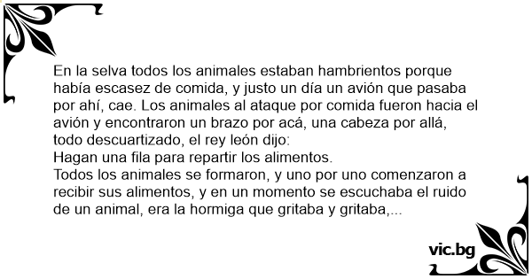 En la selva todos los animales estaban hambrientos porque había escasez de comida, y justo un día un avión que pasaba por ahí, cae. Los animales al ataque por comida fueron hacia el avión y encontraron un brazo por acá, una cabeza por allá, todo descuartizado, el rey león dijo: