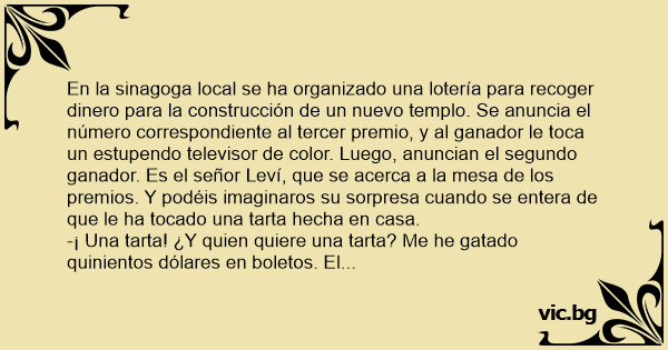 En la sinagoga local se ha organizado una lotería para recoger dinero para la construcción de un nuevo templo. Se anuncia el número correspondiente al tercer premio, y al ganador le toca un estupendo televisor de color. Luego, anuncian el segundo ganador. Es el señor Leví, que se acerca a la mesa de los premios. Y podéis imaginaros su sorpresa cuando se entera de que le ha tocado una tarta hecha en casa.