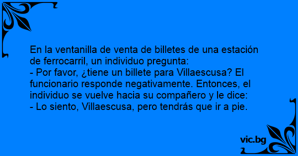 - Por favor, ¿tiene un billete para Villaescusa? El funcionario responde negativamente. Entonces, el individuo se vuelve hacia su compañero y le dice: