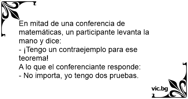 En mitad de una conferencia de matemáticas, un participante levanta la mano y dice:<br />- ¡Tengo un contraejemplo para ese teorema!<br />A lo que el conferenciante responde:<br />- No importa, yo tengo dos pruebas.
