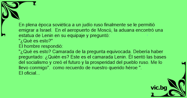 En plena época soviética a un judío ruso finalmente se le permitió emigrar a Israel. En el aeropuerto de Moscú, la aduana encontró una estatua de Lenin en su equipaje y preguntó: